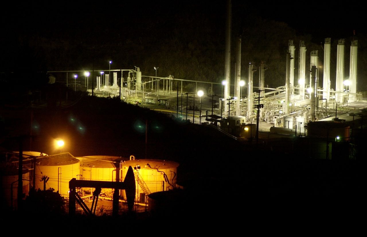 2001年2月15日,加州文圖拉市附近Aera石油生產設施的抽油機在儲油罐前形成剪影。圖片來源:David McNew/Newsmakers via Getty Images