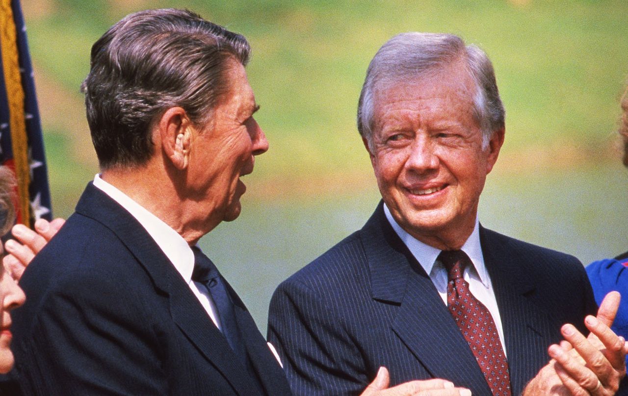 1986年10月,美國前總統吉米·卡特與羅納德·里根共同慶祝亞特蘭大卡特總統圖書館落成。圖片來源:肯·霍金斯/Zuma Press考慮到喬·拜登曾在卡特和里根政府時期擔任參議員,卻最終認定吉米·卡特的經濟政策更為可取,美國人對總統領導力保持低期望是明智的。