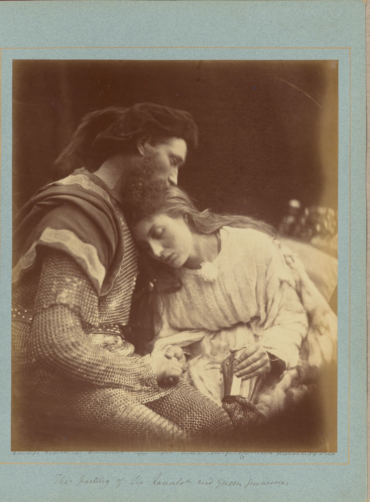 詩人阿爾弗雷德·丁尼生勳爵為維多利亞時代重述了亞瑟王傳奇,歷時五十年出版了敍事詩集《國王敍事詩》。1874年,攝影師朱莉婭·瑪格麗特·卡梅隆邀請親友扮演《敍事詩》中的角色,精心編排了蘭斯洛特與桂妮維亞訣別時極具浪漫主義色彩、略帶好萊塢風格的場景。類似的創作衝動也激發了拉斐爾前派——這羣英國畫家狂熱推崇中世紀美學,視其為質樸無華的表現手法。