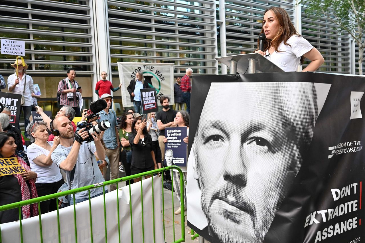 維基解密創始人朱利安·阿桑奇的妻子斯特拉·阿桑奇上月於倫敦一場反對引渡的抗議活動中發表講話。圖片來源:賈斯汀·塔利斯/法新社/蓋蒂圖片社倫敦——英國內政大臣普麗蒂·帕特爾批准引渡令後,維基解密創始人朱利安·阿桑奇現可從英國引渡至美國面臨間諜罪指控。