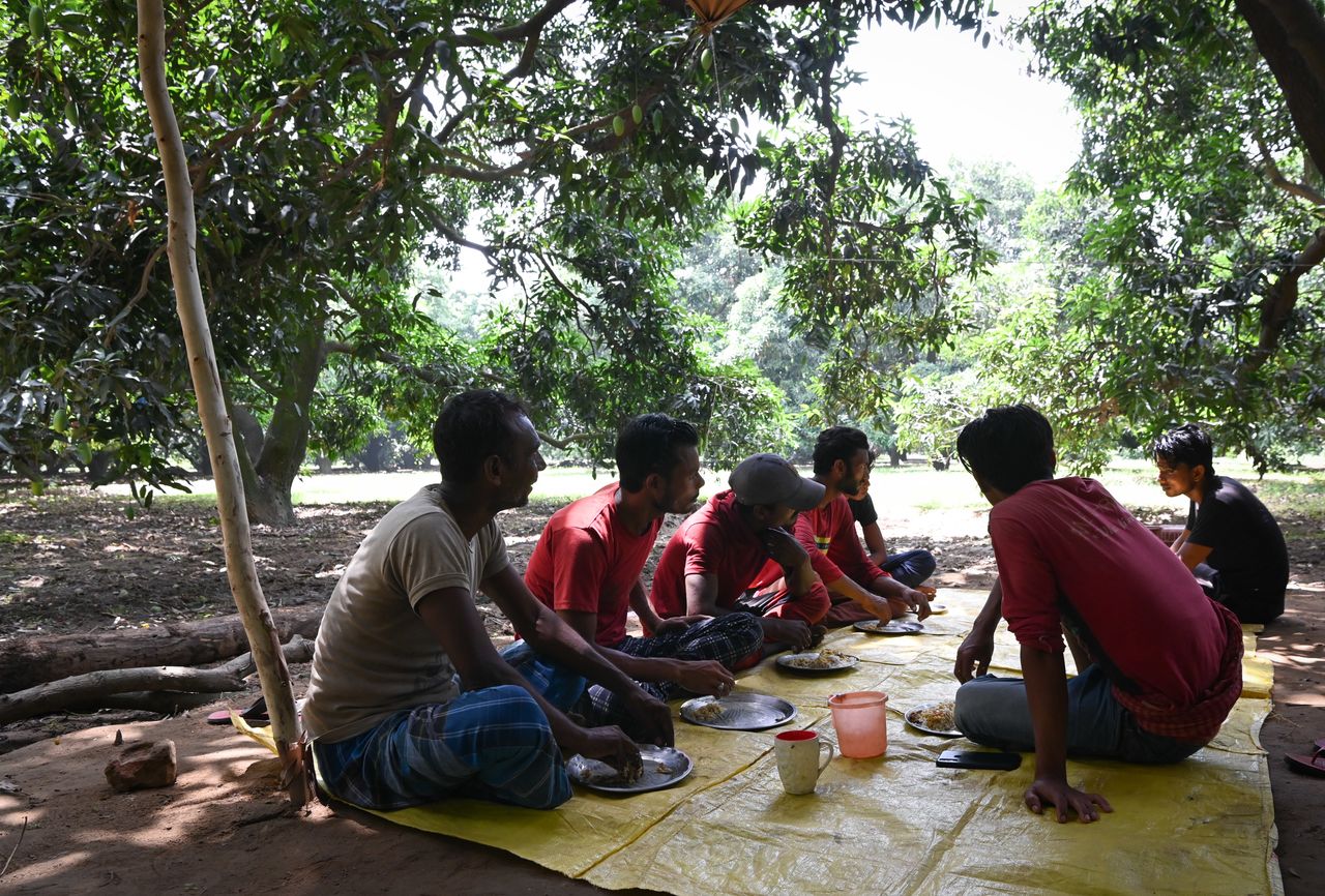 六月初,印度馬瓦納一處芒果園裏,工人們正在午休。
