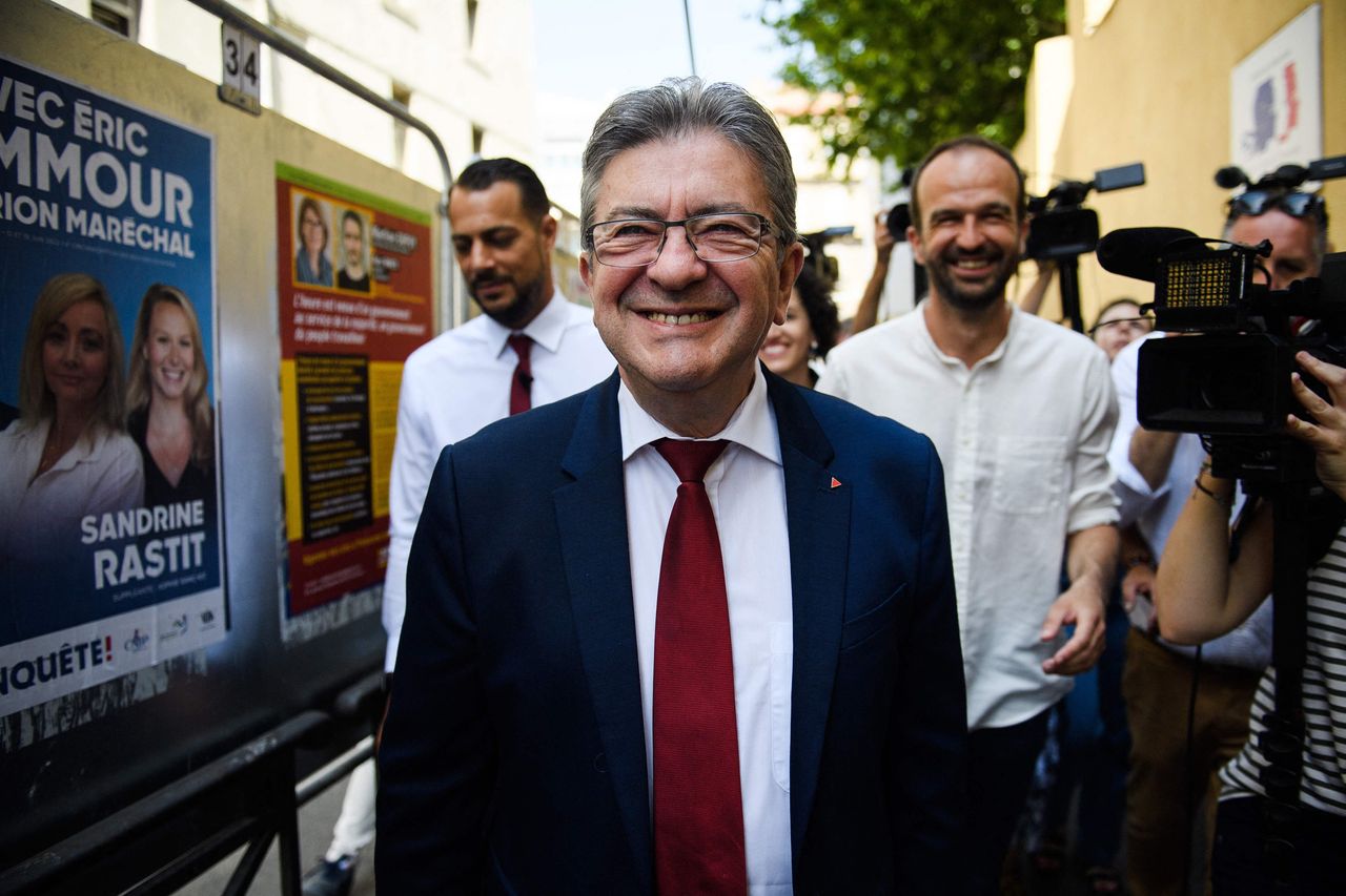 極左翼領袖讓-呂克·梅朗雄領導的聯盟在議會中贏得了席位,他於週日訪問了馬賽。照片:克萊門特·馬胡多/法新社/蓋蒂圖片社投票率為46%,按歷史標準來看較低,但高於2017年第二輪選舉的42.6%。