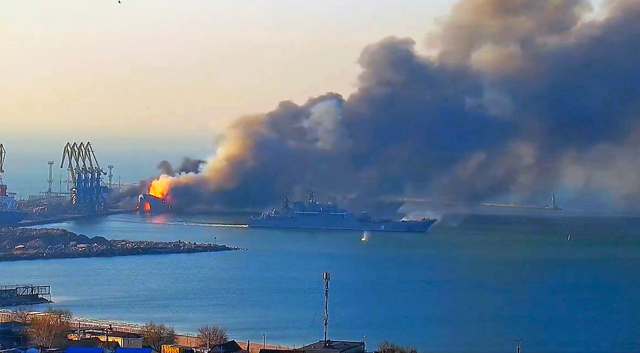 一艘俄羅斯登陸艦於三月在別爾江斯克被摧毀。照片:烏克蘭軍方/Zuma Press她表示,自佔領以來城市裏唯一真正喜悦的時刻發生在3月24日,當時烏克蘭軍隊襲擊了停泊在別爾江斯克港的俄羅斯登陸艦薩拉托夫號。