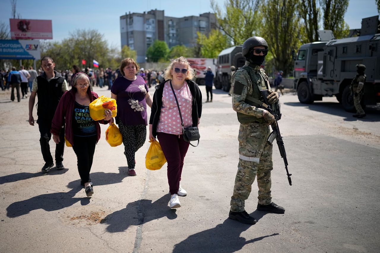 別爾江斯克市民領取補給物資時,一名俄羅斯士兵在旁警戒。圖片來源:美聯社