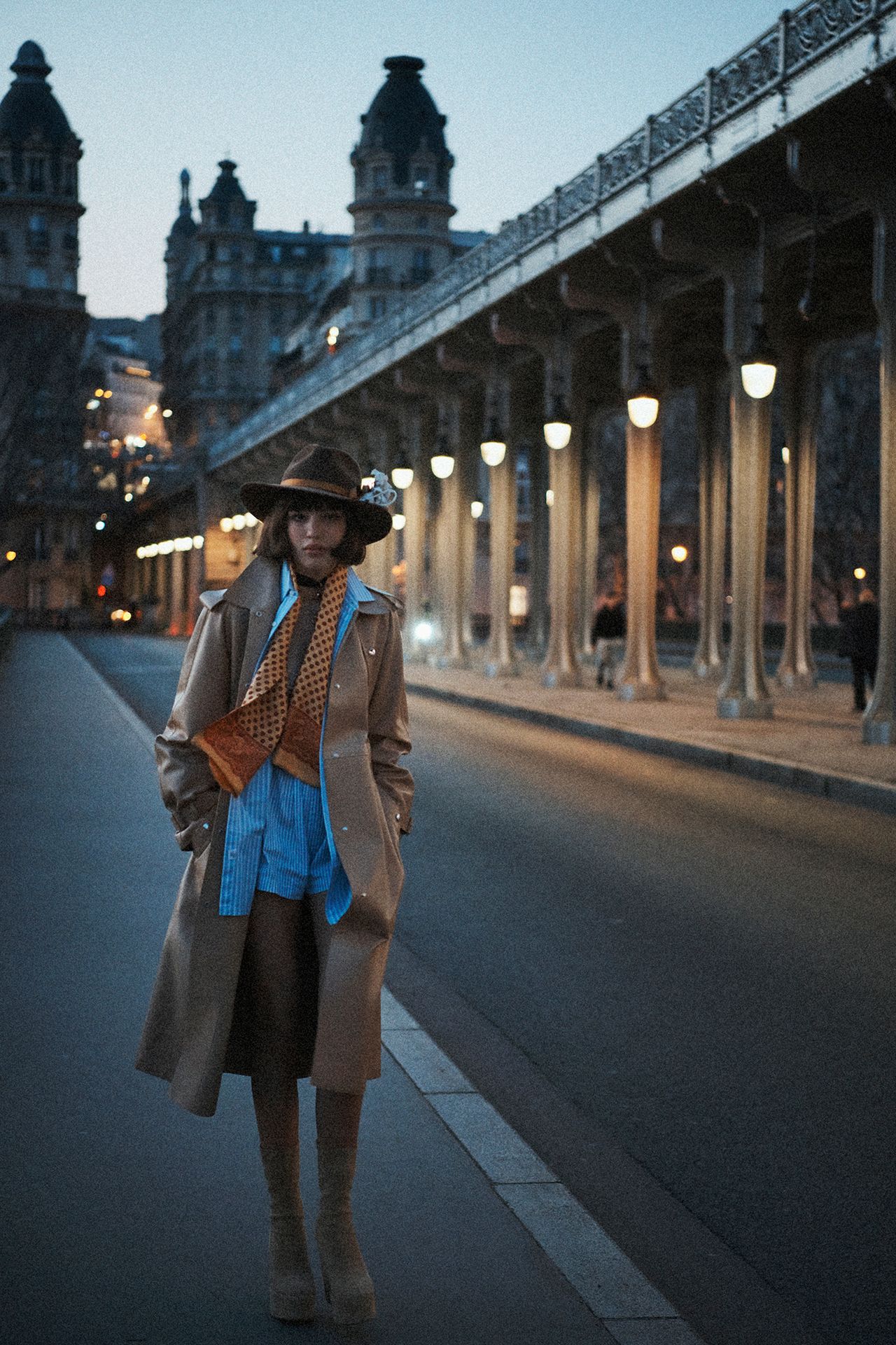 巴寶莉外套,價格請諮詢,Burberry.com,Mokuba絲帶,價格請諮詢,精選Mokuba精品店,PDPAOLA耳環(作為吊墜佩戴),135美元,PDPaola.com,復古圍巾,價格請諮詢,Kilo-Shop.com,Hedi Slimane設計的Celine項鍊,995美元,Celine.com,Salvatore Ferragamo項鍊,250美元,Ferragamo.com,巴黎德克薩斯靴子,855美元,ParisTexas.it。模特,Viva Paris的Smilla Osswald;髮型,Syd Hayes;化妝,Petros Petrohilos;製作,Kitten Production。