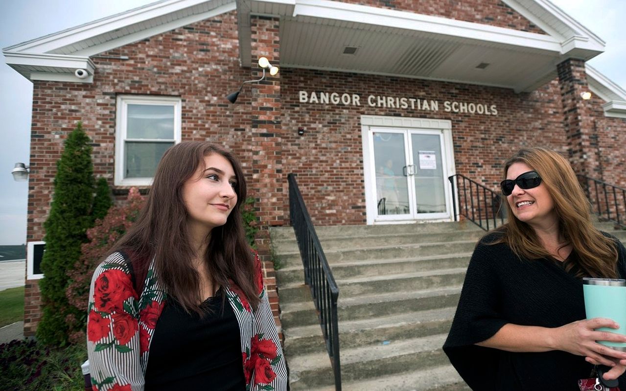 2018年,奧利維亞·卡森與母親艾米·卡森在緬因州班戈基督學校前合影。圖片來源:加博·德格雷/美聯社華盛頓——最高法院週二裁定,緬因州一項為缺乏公立學校地區學生支付私立學校學費的計劃不能將宗教學校排除在外。這是保守派佔多數的最高法院對政教分離明確界限的先例提出質疑的最新裁決。