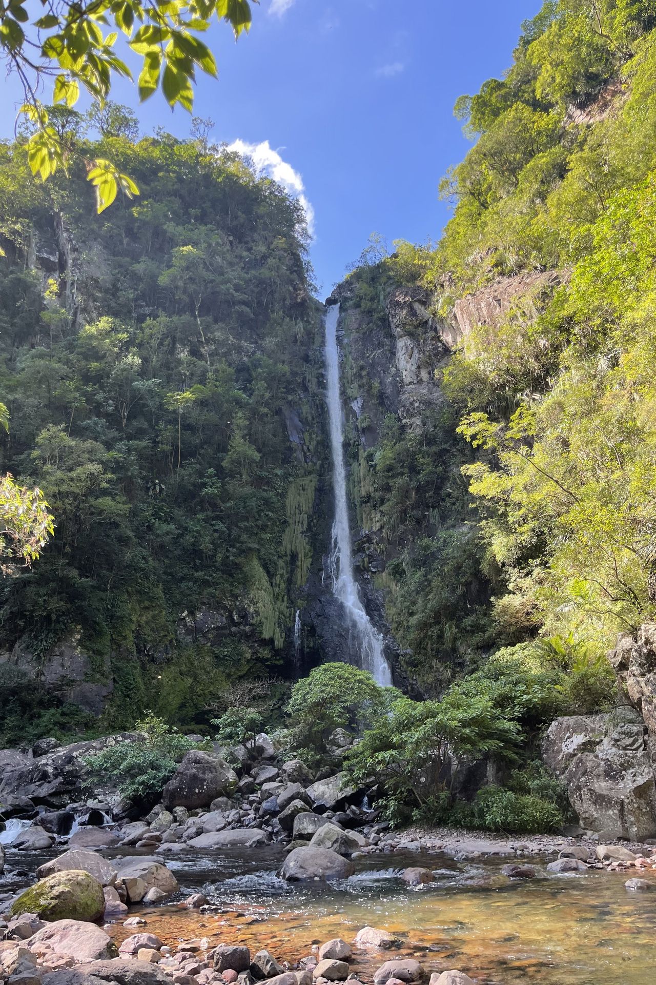 里奧杜博伊步道上眾多瀑布之一。攝影:R.T. 沃森當晚我們下到聖卡塔琳娜山脈,我預訂了瀑布下方山谷中的小木屋。決定多住幾日以體驗當地豐富的户外活動——附近大普拉亞市的旅行社提供熱氣球、四輪越野車和瀑布速降等項目。我幸運地在最後一刻搶到了王牌行程:由嚮導帶領的7小時里奧杜博伊步道徒步,這條位於巴西首批國家公園內的步道蜿蜒在伊泰明貝濟紐峽谷底部。