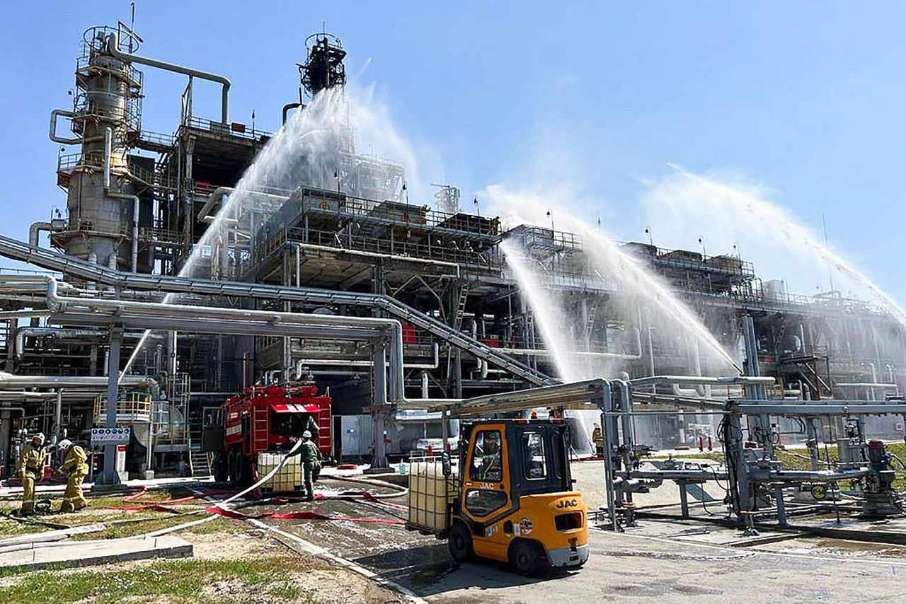 俄官方媒體發佈的畫面顯示,這座俄羅斯南部規模最大的煉油廠正噴湧出濃密黑煙,消防人員奮力控制火勢。