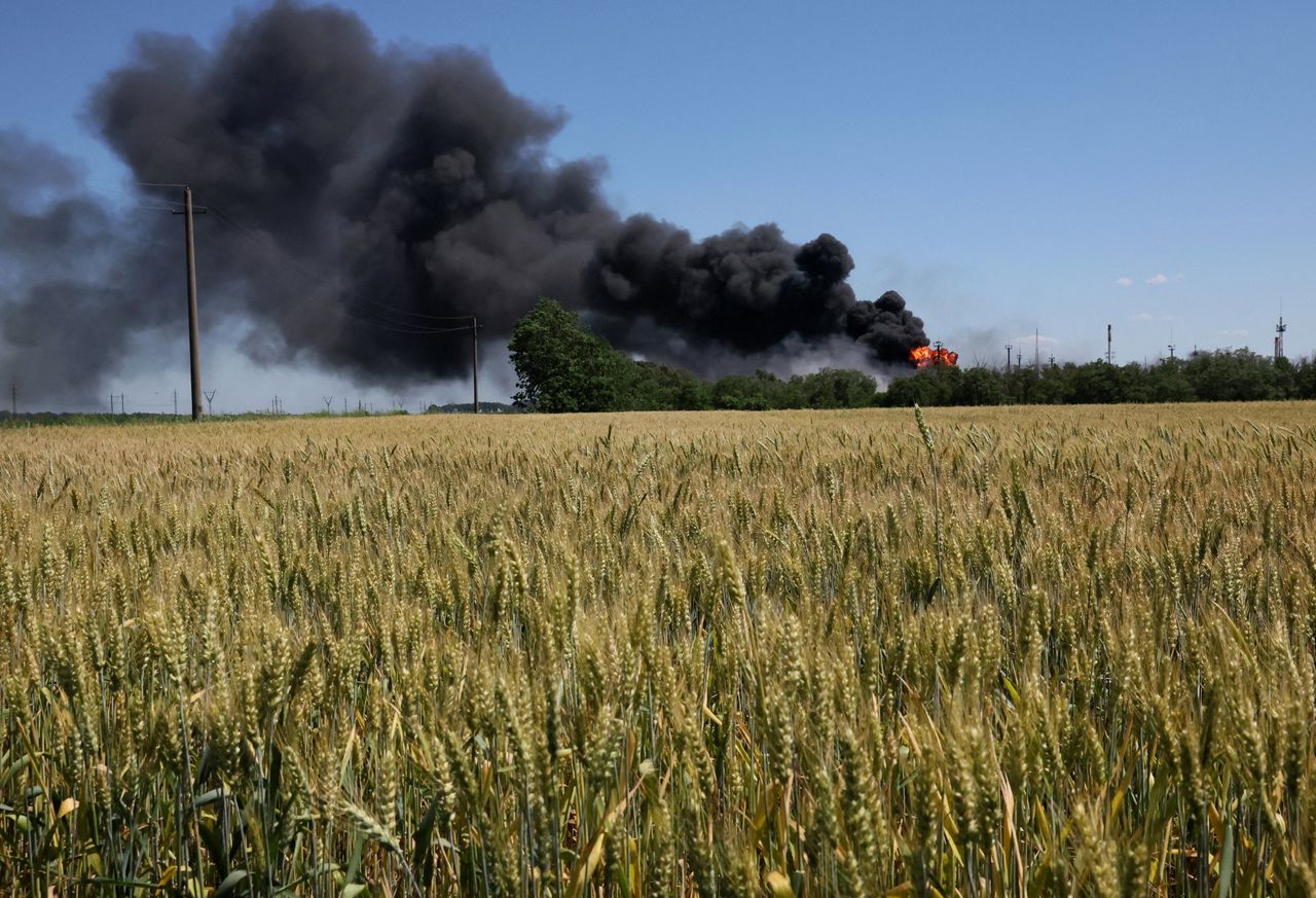 週三,羅斯托夫州新沙赫京斯克煉油廠發生火災,俄羅斯緊急服務部門展開撲救。圖片來源:俄羅斯緊急情況部/TASS/ZUMA PRESS俄羅斯入侵導致約1800萬噸穀物滯留烏克蘭。這場持續數月的戰爭已推高全球食品價格,加劇了人們對全球糧食危機的擔憂。這對烏克蘭農民而言更是雪上加霜。他們表示隨着收穫季節來臨,倉儲空間即將耗盡,且農田和設備已成為俄軍攻擊目標。