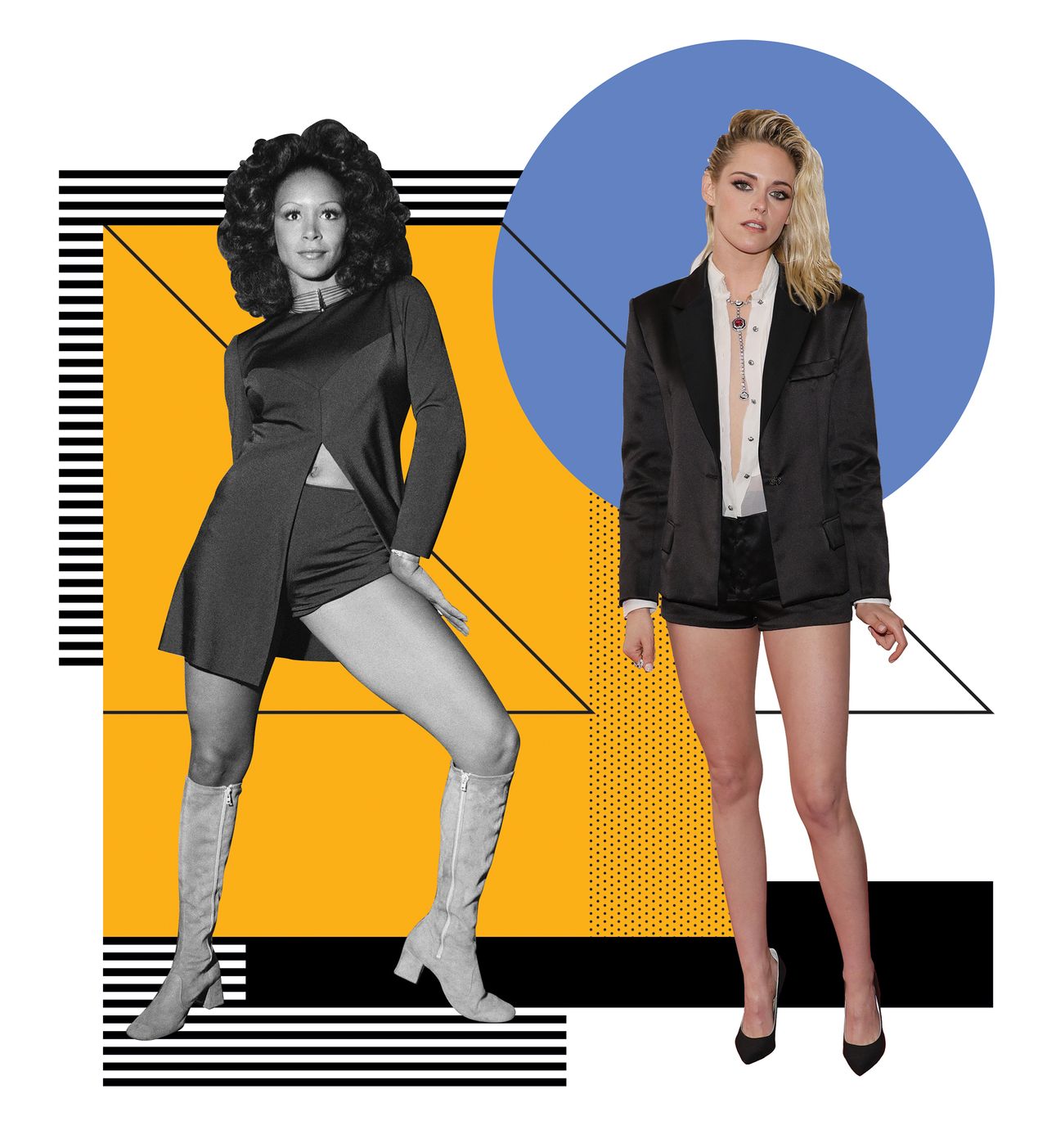 短暫相遇:左起約1970年的美國女演員兼歌手弗雷達·佩恩;2022年奧斯卡頒獎禮上身着香奈兒熱褲套裝的克里斯汀·斯圖爾特。插畫:馬特·蔡斯;蓋蒂圖片社(2張)**“低俗品味是壞事嗎?”**1971年一位英國《Vogue》撰稿人發出這樣的疑問。當時,關於得體與禮儀的舊規則被拋棄,取而代之的是個人表達與風格上的無拘無束。低俗不再糟糕,反而成為時尚。