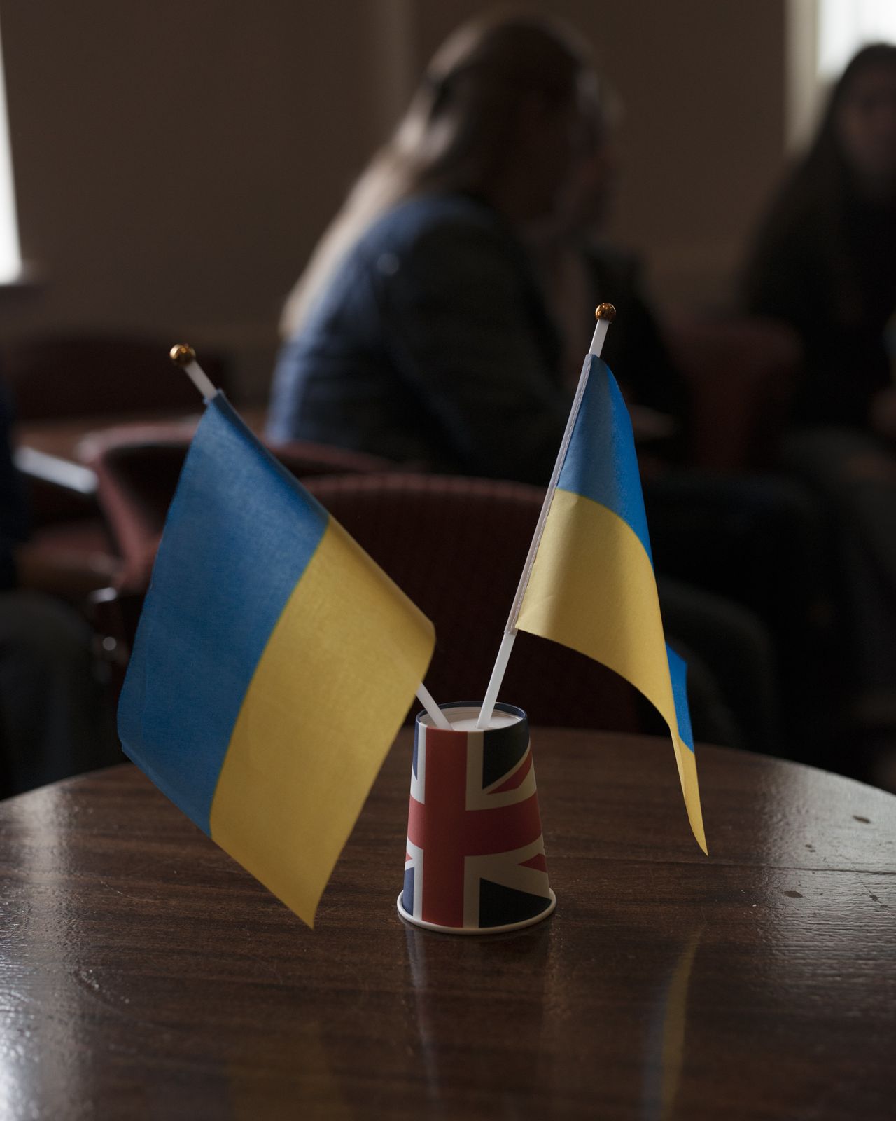 法勒姆社交俱樂部的餐桌上裝飾着用英國國旗杯子插放的烏克蘭國旗。攝影:弗朗西斯卡·瓊斯為《華爾街日報》拍攝"我們必須通過應用程序交流,“她説道,等待着自己説的話在SayHi翻譯應用中播放出烏克蘭語版本。她説大部分時候這很管用,“但有時確實會翻譯出一些非常粗魯的話。”