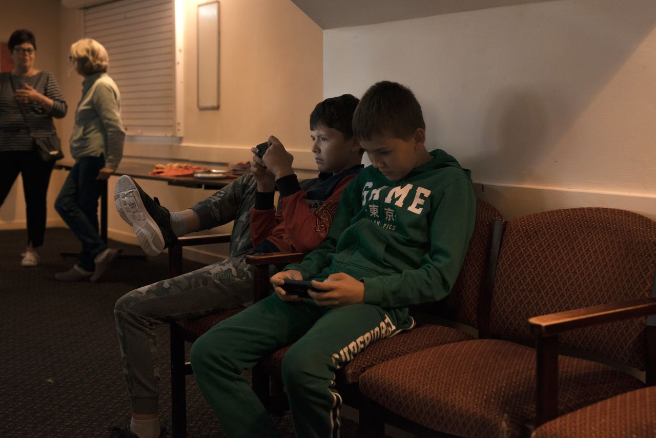 難民兒童在法勒姆為剛到該地區的烏克蘭人舉辦的週日社交活動上玩手機。照片:《華爾街日報》的弗朗西斯卡·瓊斯在許多情況下,難民們開始茁壯成長。18歲的阿琳娜·阿諾希娜和克里斯蒂娜·科列斯尼克從烏克蘭東部來到英國,與約翰·希斯曼和他的妻子克里斯汀住在一起後,找到了兼職工作。在父親節那天,這對七週前作為難民初次見面的女孩給希斯曼先生寄了一張卡片。上面寫着:“來自你的兩個烏克蘭女兒。”