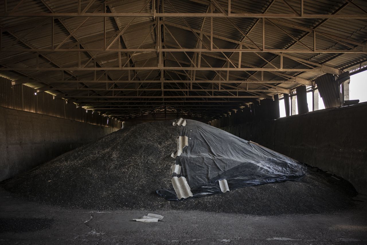 他為去年收穫的300噸葵花籽找到了買家,但這些貨物仍存放在遭炮擊損毀的陰暗倉庫中。