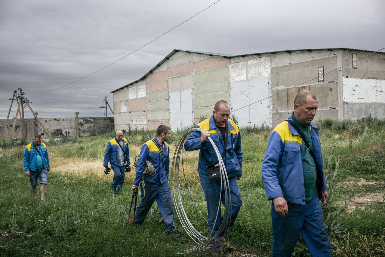 工人們正在修復塞爾吉延科農場周邊被炮火摧毀的電力線路。