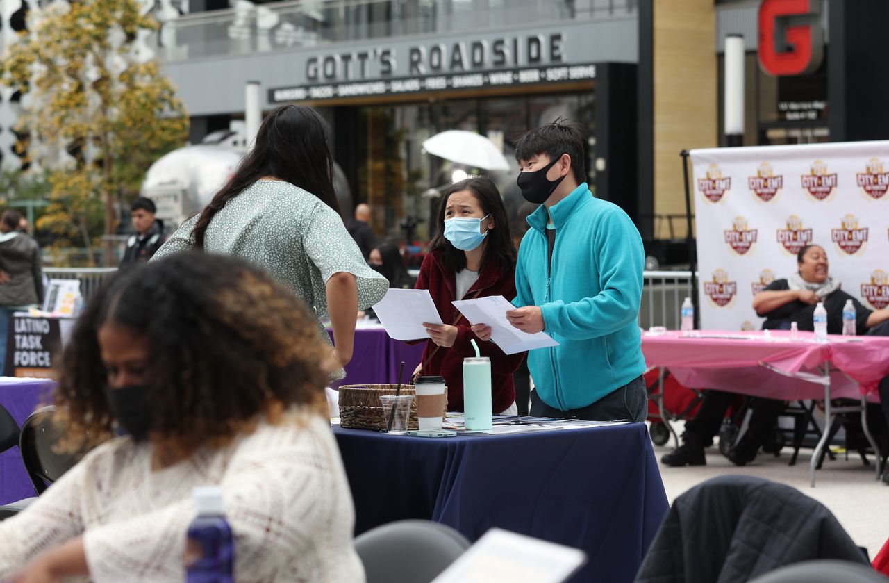 舊金山大通中心外舉行的職業培訓招聘會。上週美國新申領失業救濟人數有所下降。圖片來源:Justin Sullivan/Getty Images致信Sarah Chaney Cambon,郵箱:[email protected]
