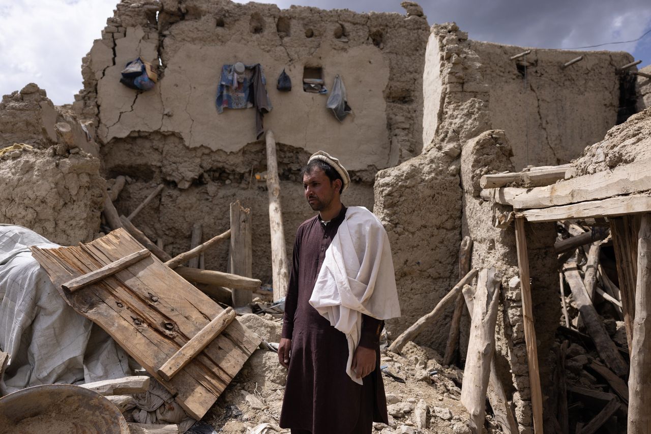 亞辛·揚站在加延區被毀的房屋前。他説,在鄰居的幫助下,他挖開廢墟,找到了11名遇難的家人,包括他的父親和兩個兄弟。刊登於2022年6月24日印刷版,標題為《援助開始抵達地震災區》