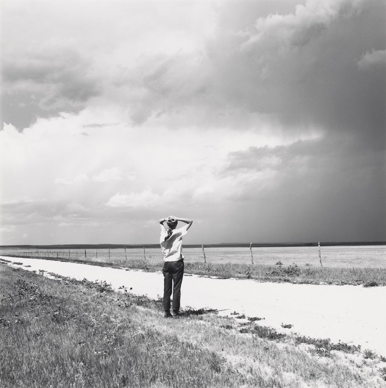 展覽的第一部分“禮物”幾乎全部由科羅拉多平原的照片組成;除了一些土路、兩道鐵絲網和一座遠處的建築外,沒有任何人造物。這些照片大多將地平線置於畫面底部,因此圖像主體是天空與偶然飄過的絢麗雲彩,它們摒棄戲劇性而追求寧靜。該部分唯一出現的人物是亞當斯先生的妻子;在首幅作品《克爾斯汀享受微風,科羅拉多州基奧塔以東》(1969)中,她背對我們站立,雙手抱頭,凝望廣袤無垠的荒原。這幅作品尺寸僅約7.5×7.5英寸,有些甚至更小,沒有大幅印刷品。亞當斯作品的獨特之處在於你必須靠近細看——無法在畫廊漫步時隨意一瞥就領會其精髓。