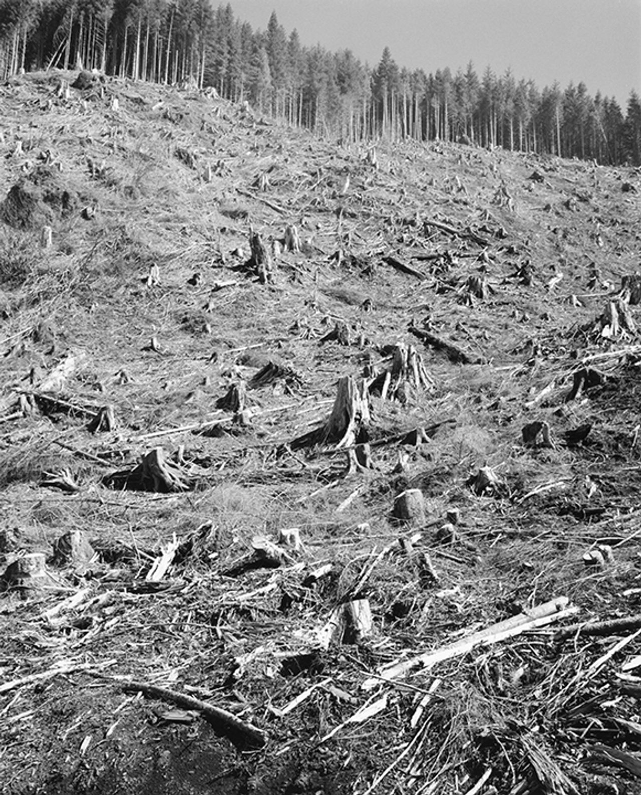 羅伯特·亞當斯的《皆伐區,俄勒岡州克拉特索普縣》(約2000年)圖片來源:羅伯特·亞當斯/舊金山弗倫克爾畫廊亞當斯在丹佛地區秘密拍攝了展現危險引發焦慮的照片。但若沒有牆面文字説明,這些人物與其他街頭攝影中無意被拍到的路人並無顯著差異。他在表現空氣污染和皆伐木方面更為成功。在《加州科爾頓拉洛馬山頂》(1983年)前景左側,灌木覆蓋的懸崖尚清晰可見,但遠處山丘和漸次退遠的電纜塔逐漸消失在霧霾中——這是一幅關於不可見之物的影像。《皆伐區,俄勒岡州克拉特索普縣》(約2000年)與《皆伐區,俄勒岡州庫斯縣》(約2000年)中廣袤的樹樁地帶,有力證明了森林遭受的破壞。