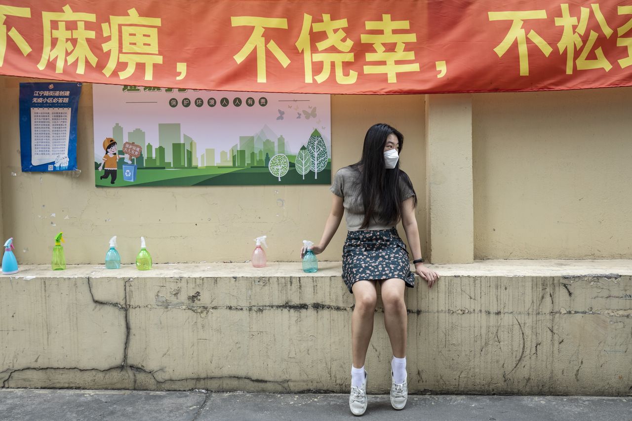 6月22日,Yvette Yuan坐在上海小區入口處。封控期間,她常在此等待自己組織的食品配送。**5月23日:**Yvette Yuan的鄰居檢測陽性,讓這位20歲女孩陷入絕望。