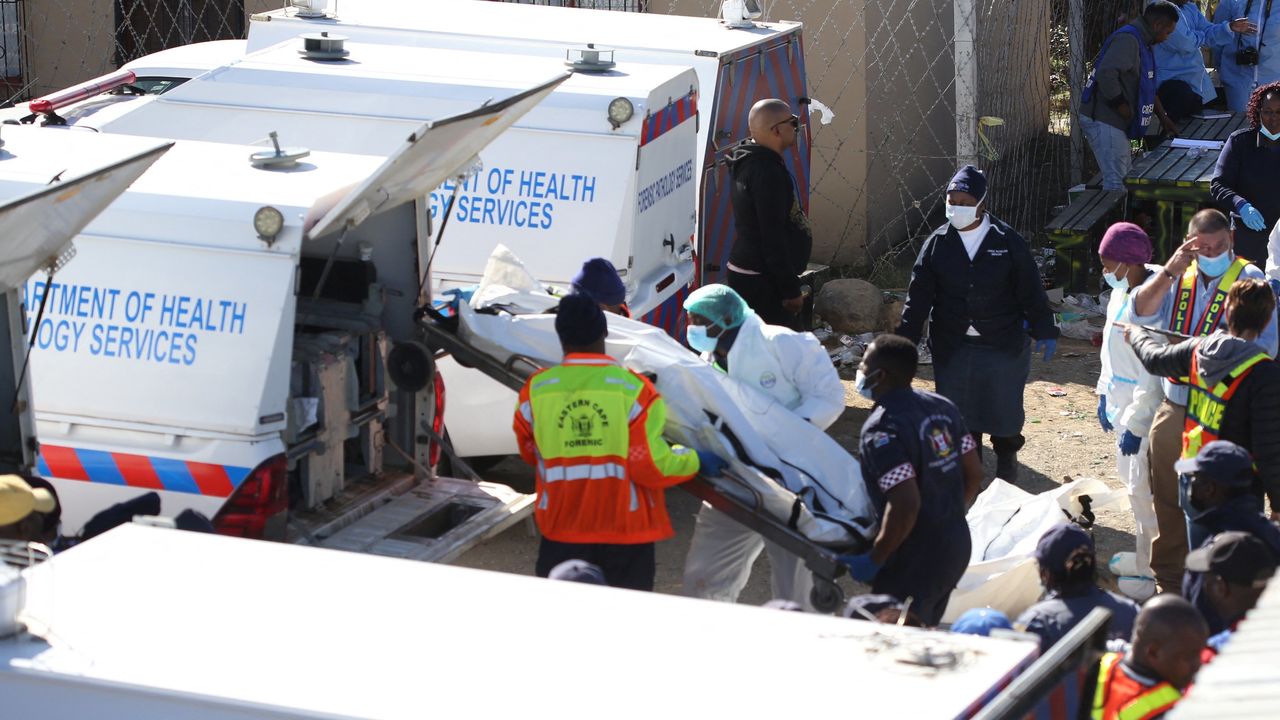 週日,東倫敦一家酒館內發現多具屍體,其中一具被裝入貨車運離現場。圖片來源:STRINGER/REUTERS南非當局正在調查22名年輕人的死亡事件,這些年輕人的屍體於週日上午在東倫敦沿海小鎮的一家酒館內被發現,其中一些死者年僅14歲。