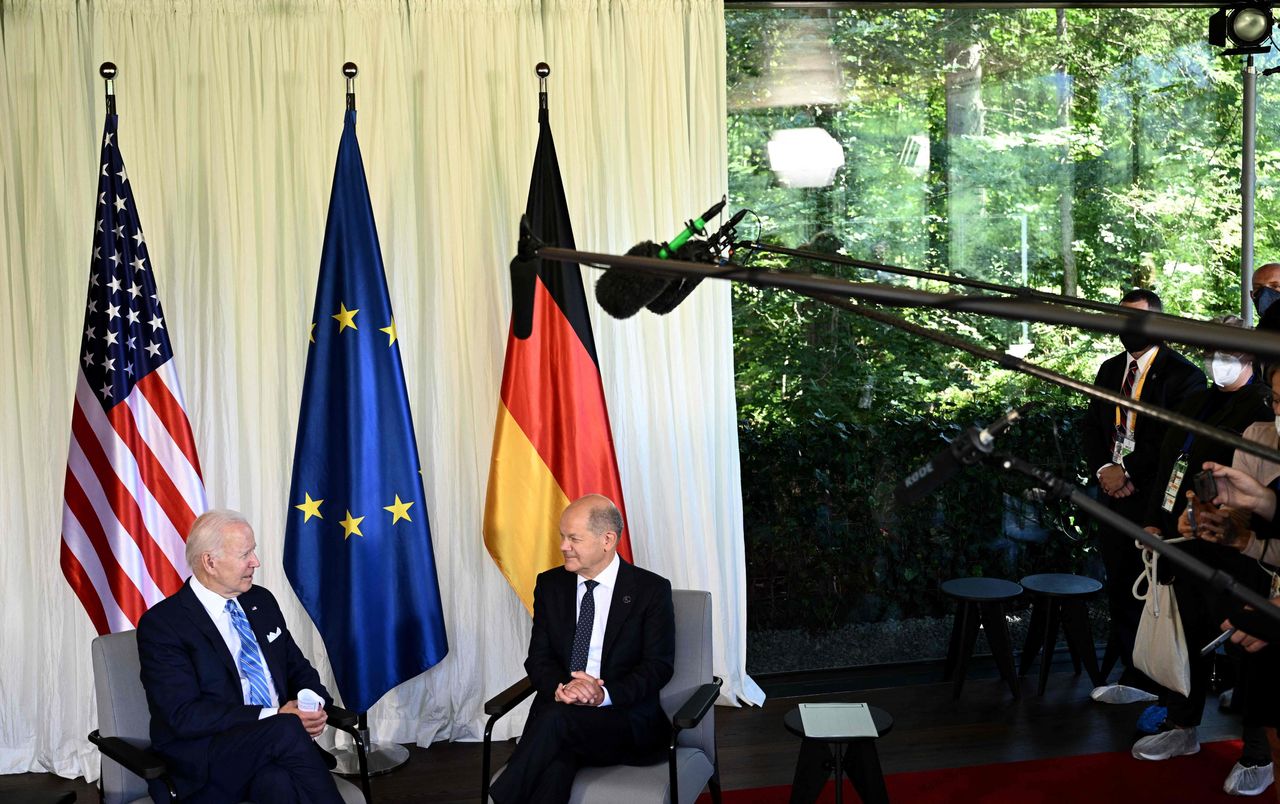 美國總統拜登在德國南部舉行的七國集團峯會上與德國總理奧拉夫·朔爾茨交談。圖片來源:布倫丹·斯米亞洛夫斯基/法新社/蓋蒂圖片社拜登總統在推特上發文稱:“美國已讓普京付出了前所未有的代價,切斷了他資助烏克蘭戰爭所需的收入。七國集團將共同宣佈禁止進口俄羅斯黃金,這是俄羅斯每年賺取數百億美元的主要出口商品。”