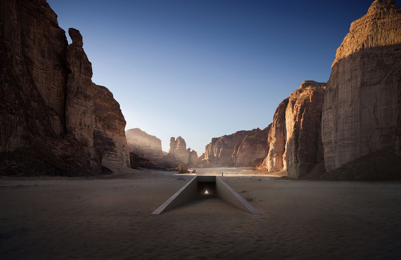 艾哈邁德·馬特為新藝術谷創作的裝置作品(效果圖所示)將利用地下隧道和鏡面,為遊客營造目睹——甚至可能置身於——海市蜃樓的視覺幻象。圖片來源:ATHR畫廊沙特阿拉伯正通過在未來幾年邀請詹姆斯·特瑞爾、邁克爾·海澤等頂尖藝術家在其西北部沙漠永久安置大型藝術裝置,朝着打造國際藝術目的地的長期規劃邁出重要一步。