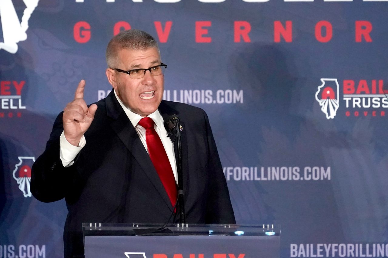 獲得前總統特朗普背書及億萬富翁理查德·尤萊因資金支持的達倫·貝利,週二在伊利諾伊州埃芬漢姆贏得州長共和黨提名後向人羣發表講話。照片:Charles Rex Arbogast/美聯社在伊利諾伊州,由於十年一次的選區重劃改變了該州的政治版圖,兩場國會眾議院席位的初選中出現了現任議員相互對決的局面。