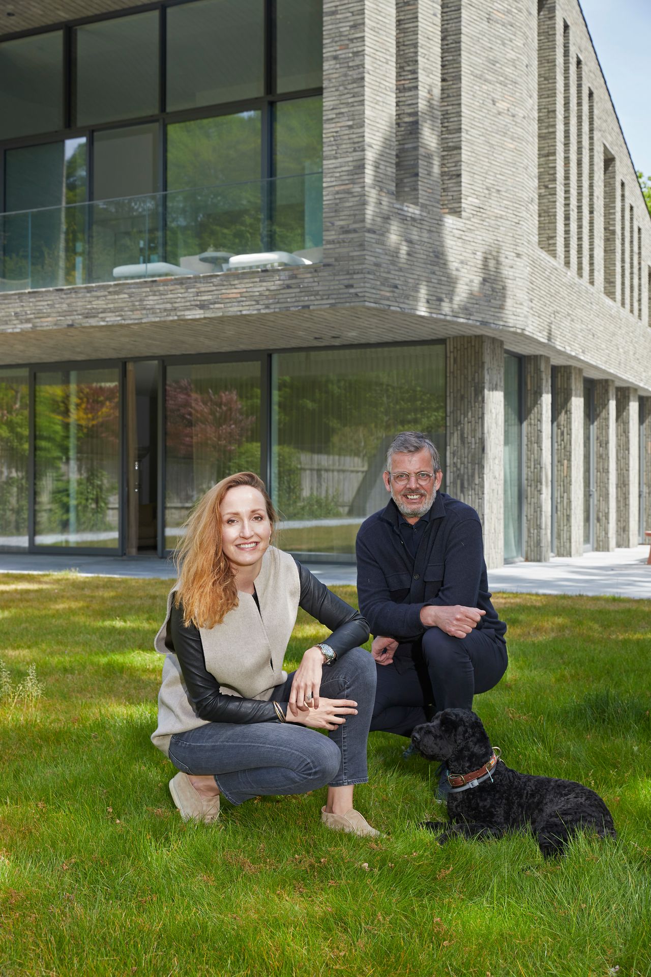 38歲的商業地產專業人士英格·布呂爾與她54歲的伴侶羅布·弗斯洛特(歐洲食品集團CEO)以及他們的可卡頗犬奧托。攝影:赫爾曼·範·赫斯登(《華爾街日報》特約)項目初期,“我給喬斯傳達了矛盾的信息”,布呂爾女士説道。她描述自己想要的房子是"弗蘭克·勞埃德·賴特遇見斯堪的納維亞"的風格。