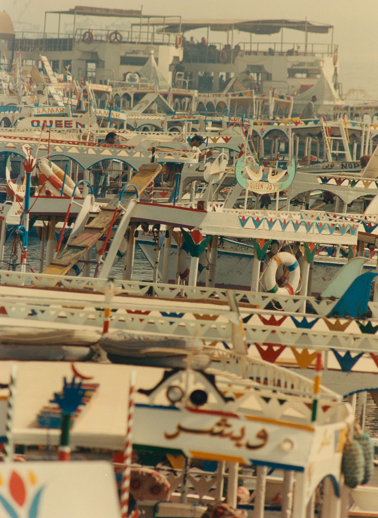努爾埃爾尼羅河遊船公司某艘帆船上船員的牀墊。遊船南行途中,如今會在埃斯納修復後的克努姆神廟停靠,這座神廟色彩鮮豔的壁畫於今年早些時候揭幕。航線的終點依然是阿斯旺,這個港口毗鄰尼羅河第一瀑布,湍急的激流使船隻無法通行。這裏仍由老瀑布酒店(現為索菲特)主導,阿加莎·克里斯蒂曾在此寫下《尼羅河上的慘案》,凝望着半沉沒的巨石,它們像厚皮動物一樣蹲伏在往返運送旅客的三角帆船之間。