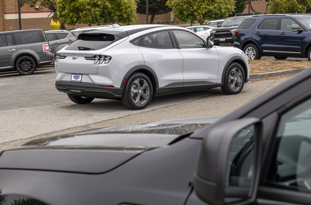 加州科爾馬市一家經銷商處待售的福特野馬Mach-E電動SUV;福特計劃於9月發佈針對經銷商的電動汽車銷售新規。圖片來源:David Paul Morris/彭博新聞社部分經銷商表示,福特正試圖同時吸引投資者、消費者和經銷商。
