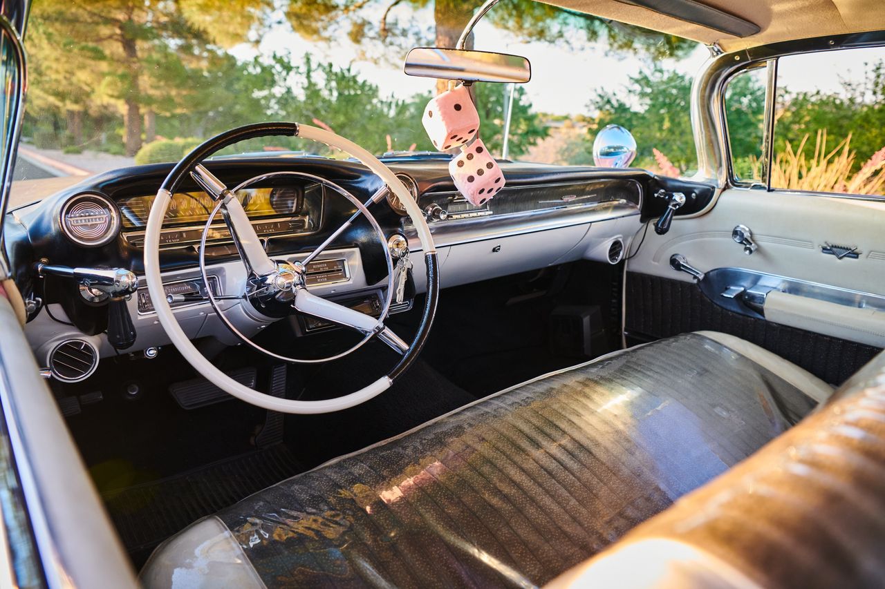 粉色絨毛骰子與車身塗裝及拉斯維加斯風情相得益彰。圖片來源:Saeed Rahbaran/華爾街日報我們將車運回密歇根州,1999年舉家遷往拉斯維加斯時又將其運回,算是完成了一次往返之旅。這輛車已陪伴我們33年,除漆面外——包括內飾、390立方英寸V8發動機、變速箱——全部保留原廠配置。出廠時為白色,前車主將其改噴為山月桂粉色。