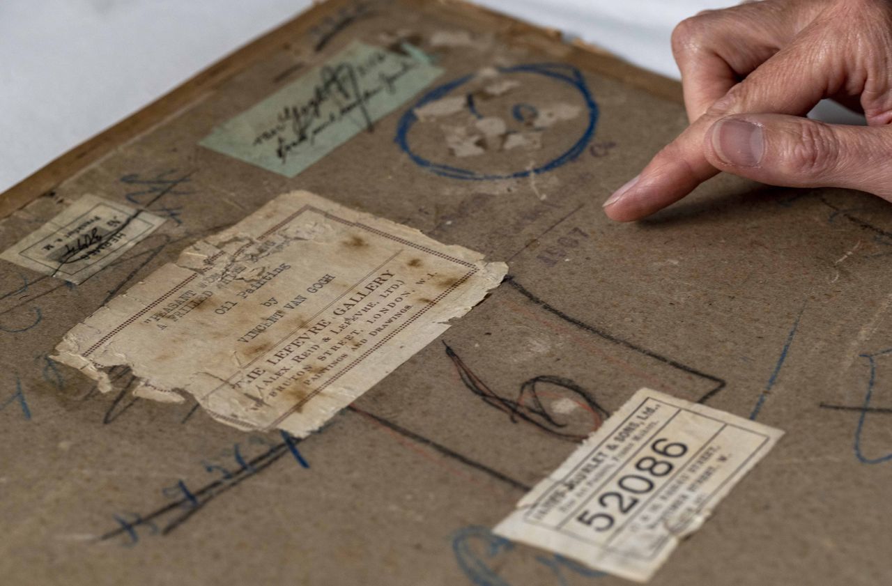 一張未註明日期的照片,顯示了梵高《農婦頭像》背面的標籤和標記。照片:尼爾·漢納/手稿/Shutterstock高級策展人弗朗西斯·福爾説,國家美術館收藏了三件梵高的作品。《農婦頭像》自1960年以來一直是該博物館的藏品。