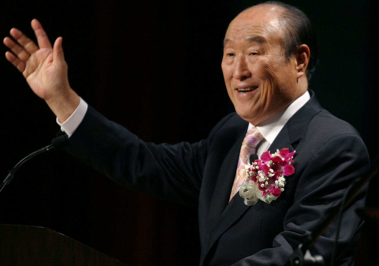 已故統一教創始人文鮮明牧師,攝於2005年。圖片來源:John Marshall Mantel/Associated Press在其網站上,幸福實現黨宣稱其目標包括阻止中國共產黨霸權、構建日美韓緊密同盟,以及推動修改日本憲法以加入家庭價值觀條款。