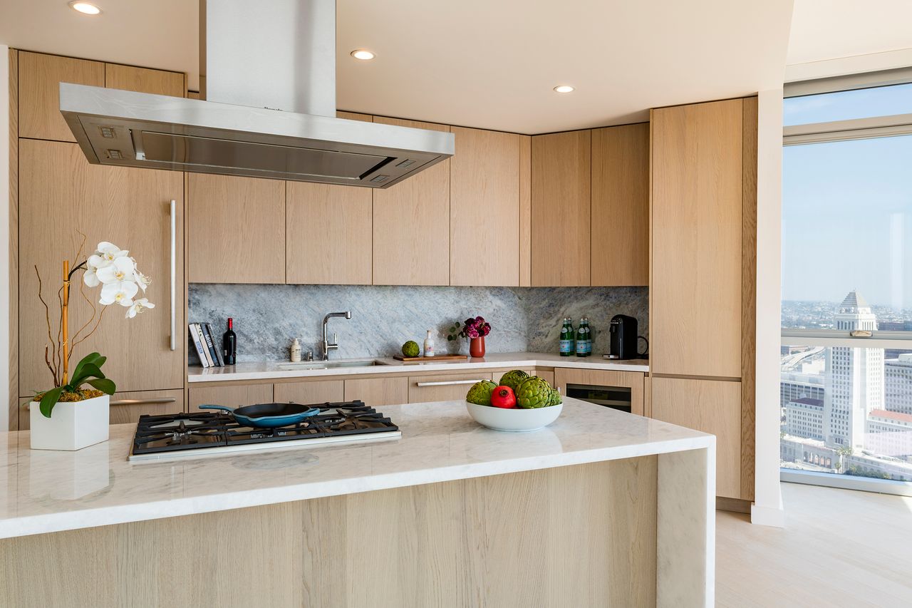 這套位於洛杉磯市中心、由弗蘭克·蓋裏設計的The Grand LA綜合體內的待租公寓擁有三間卧室和兩間浴室,面積1,638平方英尺(約152平方米),層高9英尺(約2.7米)。開放式廚房配有白色石材枱面、Blue Fusion石英岩防濺板、橡木櫥櫃和緩閉抽屜。