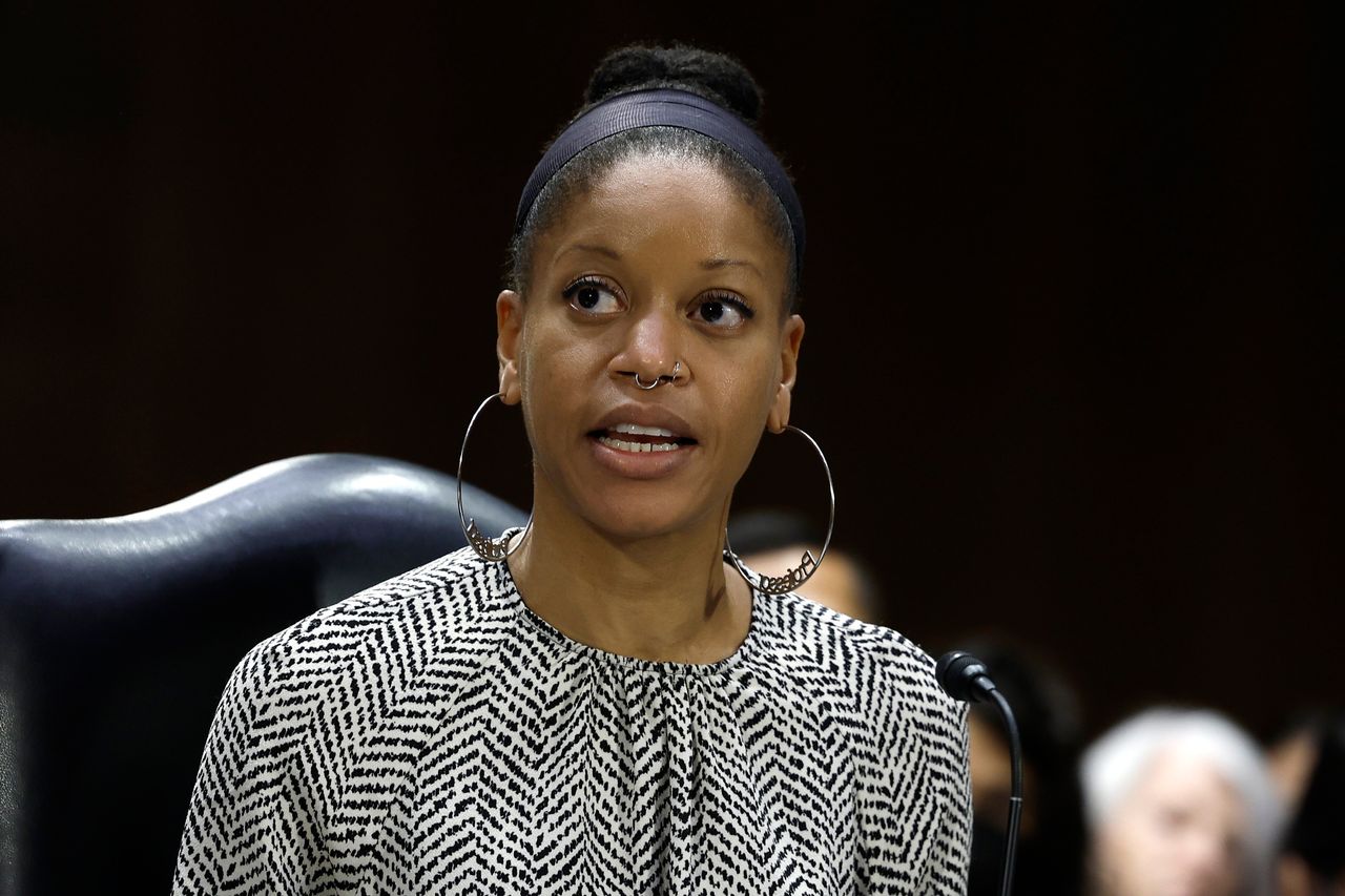 加州大學伯克利分校法學院教授基婭拉·布里奇斯7月12日在華盛頓參議院司法委員會聽證會上發言。圖片來源:安娜·馬尼梅克/蓋蒂圖片社參議員約翰·科寧(德州共和黨)與喬希·霍利(密蘇里州共和黨)在7月12日司法委員會關於“後羅伊時代的美國:多布斯案判決的法律影響”聽證會上質詢加州伯克利法學院教授基婭拉·布里奇斯: