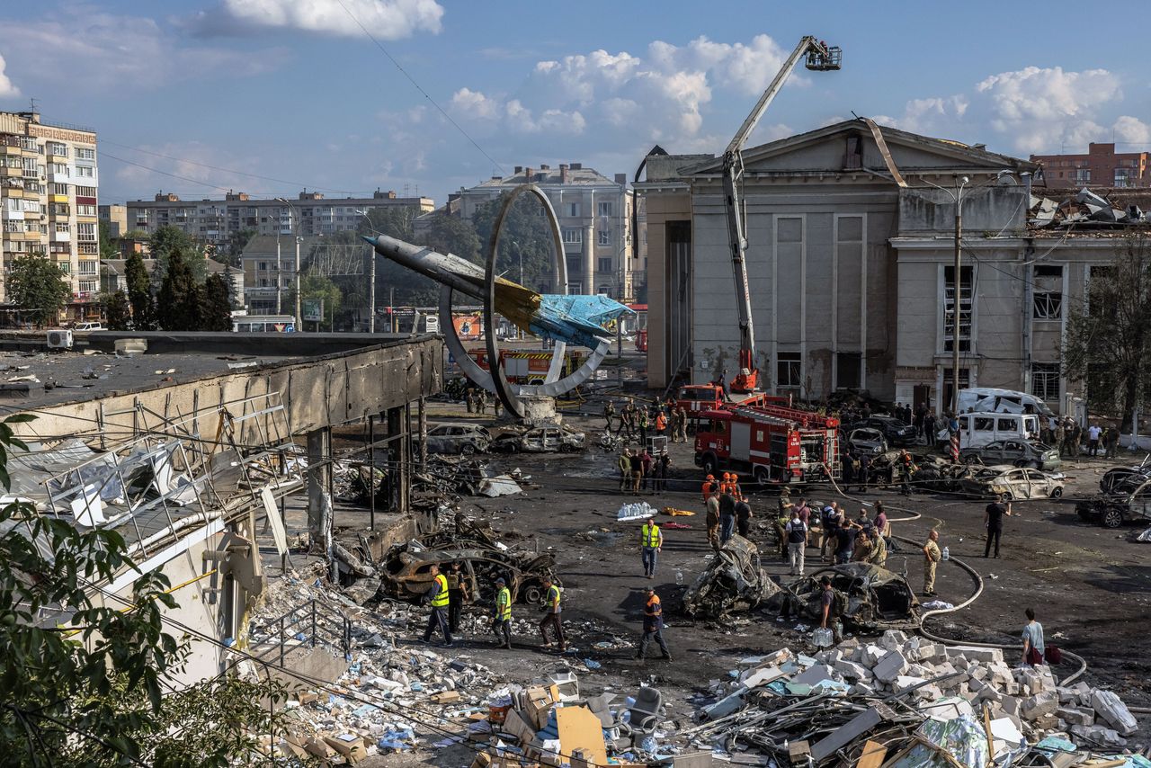 在烏克蘭中部文尼察市遭遇俄羅斯導彈襲擊的現場,消防員、救援人員、軍隊和警察正在展開工作。圖片來源:roman pilipey/Shutterstock