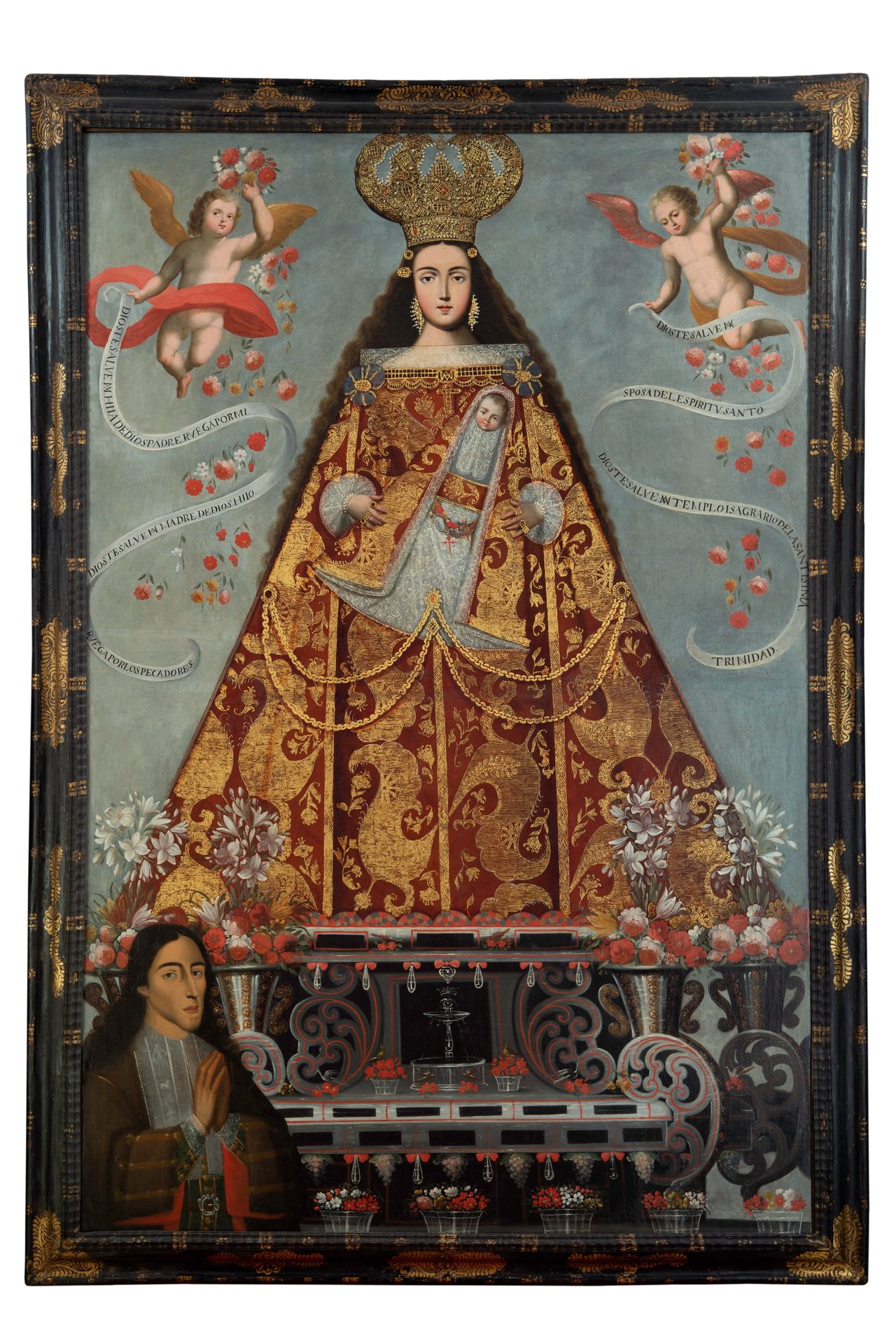 巨幅畫作《帶捐贈者的伯利恆聖母》描繪了這樣一尊被尊為庫斯科主保聖人的聖像。這幅18世紀油畫出自著名的庫斯科畫派,該流派由原住民與混血藝術家組成,以華美織物的絢麗呈現聞名,其作品在整個地區廣受追捧。“這是威嚴的聖像,“格拉納多斯説,“你看到的是位女王。”