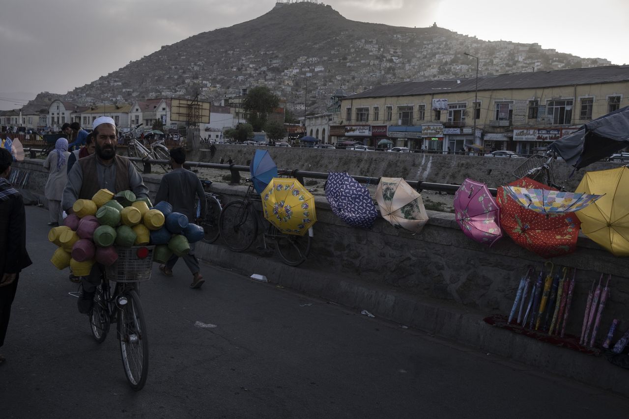 一名攜帶塑料水桶的男子騎車經過喀布爾河畔出售的遮陽傘。圖片來源:Joël van Houdt/華爾街日報塔利班新政府剛掌權時,為吸引外資曾展開公關攻勢,試圖展現與國際社會建立良好關係的意願,特別強調會尊重女性權利。
