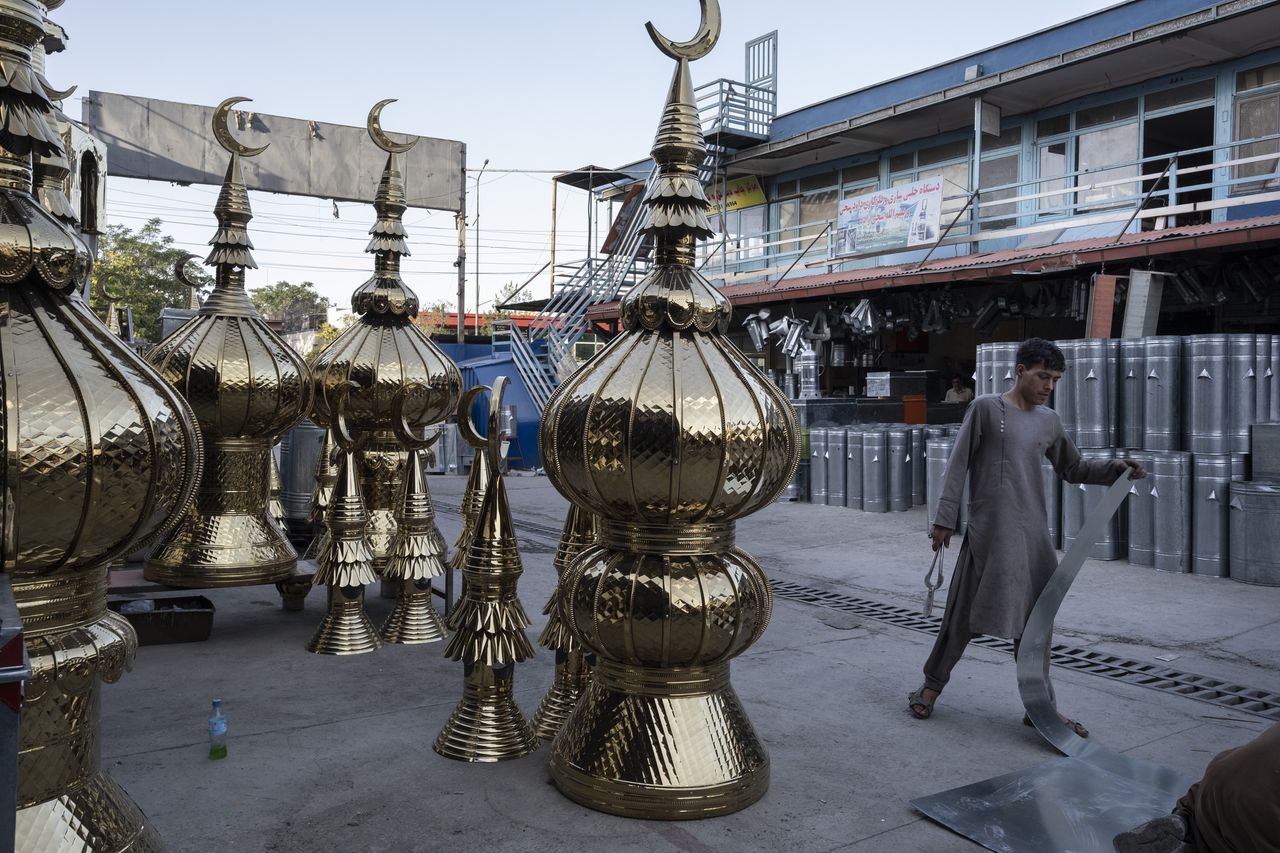 一名工人在出售清真寺尖塔的店鋪旁切割金屬板製作爐具。圖片來源:Joël van Houdt/《華爾街日報》