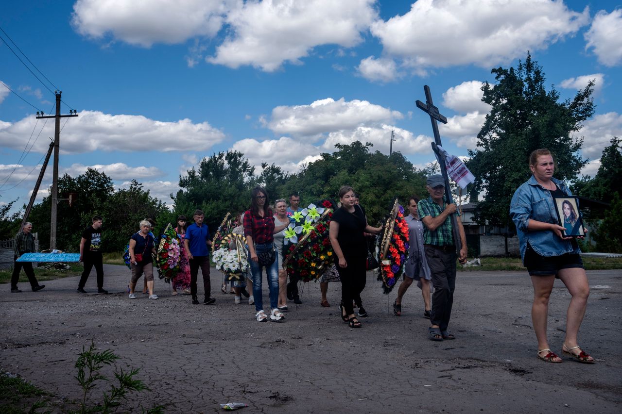 烏克蘭東部波克羅夫斯克一名在俄羅斯火箭襲擊中喪生的女性的葬禮隊伍。圖片來源:納裏曼·埃爾-莫夫蒂/美聯社
