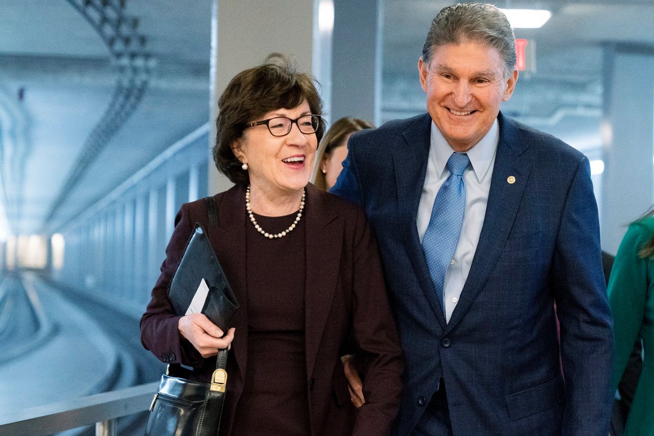 2021年12月2日,緬因州共和黨參議員蘇珊·柯林斯與西弗吉尼亞州民主黨參議員喬·曼欽在國會山。圖片來源:傑奎琳·馬丁/美聯社刊載於2022年7月19日印刷版,標題為《改革選舉計票法》。