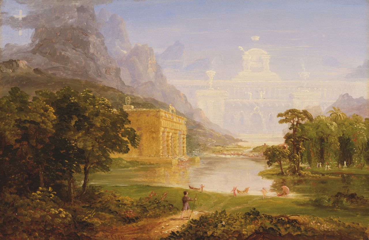 托馬斯·科爾的《雲景》(1846-47年)圖片來源:托馬斯·科爾國家歷史遺址這場動人的展覽最終凸顯了藝術生命戛然而止的悲劇。科爾當時正處創作全盛期,新畫室更激發了他的活力,他計劃在承載道德使命的風景藝術中實現更大突破。現存四幅為《十字架與世界》(1847年)系列創作的油畫習作強烈傳遞着這一抱負——該系列計劃包含五幅八英尺鉅作,科爾生前近乎完成其中三幅,可惜現已遺失。這些作品在敍事上拓展並豐富了他著名的寓言四部曲《生命之旅》(1839年,附近展有該系列四幅習作),後者通過普通人從嬰孩到死亡的歷程展現生命圖景。《十字架與世界》旨在記錄兩位年輕朝聖者的對立人生:一人追尋精神真理的崇高之路,終在十字架聖光中獲得救贖;另一人沉溺世俗歡愉,最終墮入黑暗荒蕪的深淵。儘管規模有限,現存四幅習作仍展現了科爾宏大的藝術視野,尤其是《世俗朝聖者》抵達墮落終點時,天空中夢幻般懸浮的享樂宮殿,令人心悸地昭示着誘惑的虛妄。