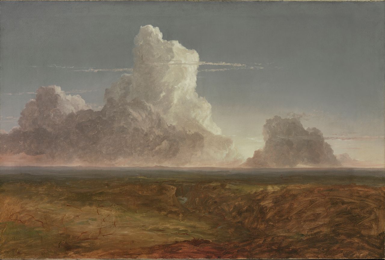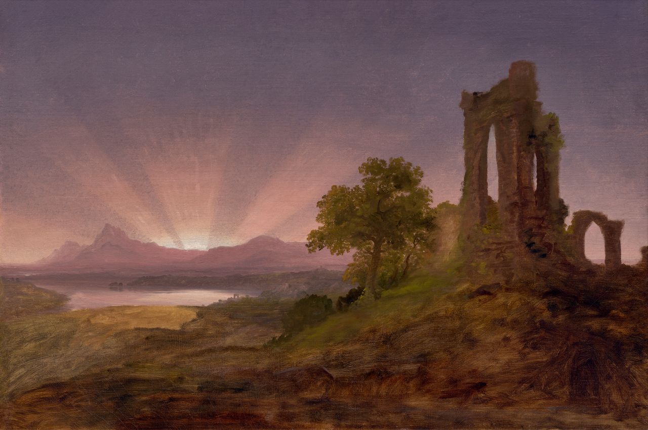 這場私密展覽以出人意料的方式引人入勝。通過將藝術家生涯中的完成品與未竟之作並置,我們得以洞察科爾的視覺想象力與工作方法。其未完成的大型作品《雲景》(1846-47年)——天空已精細渲染而前景僅鋪底色——揭示了科爾慣常自上而下的創作方式:從最高處的深藍到地平線的淺藍微妙過渡,精準模擬自然光影。雖不似英國風景畫家約翰·康斯太勃爾那般痴迷氣象研究,科爾同樣對雲層等自然現象進行過大量觀察。陰鬱的《羅馬鬥獸場內部》(1832年)呈現瞭如今遊客熟悉的雜草叢生景象,這幅建築被自然吞噬的畫面,可視為其著名《帝國興衰》系列(現藏於曼哈頓紐約歷史學會)終章構思的雛形——該系列正是他在此次羅馬旅居期間醖釀的。