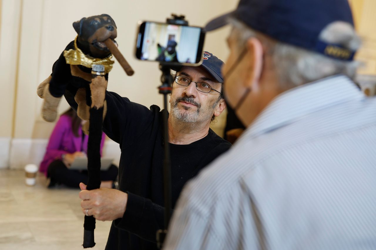 上個月,演員兼喜劇演員羅伯特·斯米格爾在國會大廈內拍攝時手持名為"勝利的侮辱喜劇狗"的木偶。圖片來源:Chip Somodevilla/Getty Images當局表示,《斯蒂芬·科爾伯特晚間秀》節目工作人員上月在美國國會大廈因拍攝片段涉嫌非法闖入被捕後,將不會被起訴。