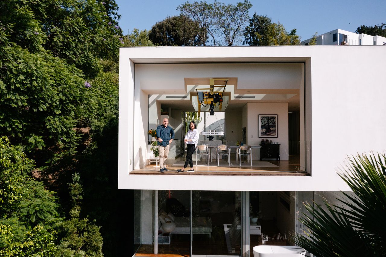 愛麗絲·金姆與約翰·弗裏德曼在他們自行設計的洛杉磯住宅中。圖片來源:《華爾街日報》傑西卡·桑普爾他們的答案是一棟價值238萬美元的玻璃灰泥住宅——一座懸於洛杉磯社區及同名水庫上方的明快現代奇幻屋。在這個不斷演變的項目中居住數年後,夫婦倆於今夏終於完工。這個歷時數年的項目見證了這對建築師夫婦非同尋常的合作。