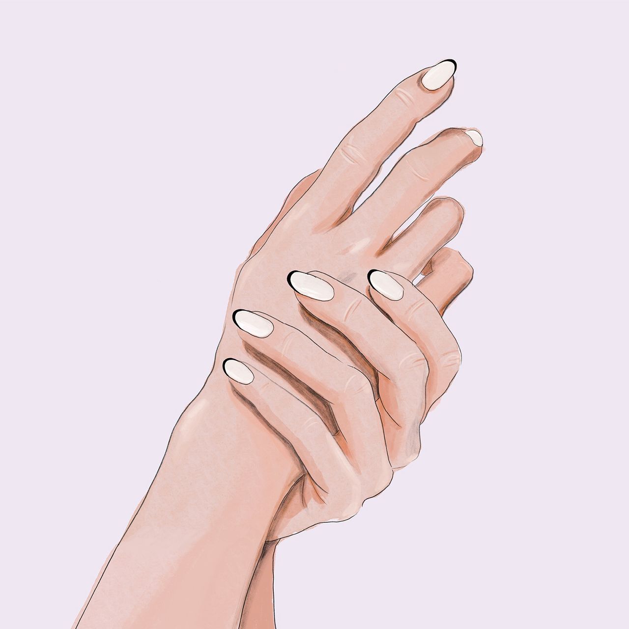 在家打造完美法式美甲,Boyce女士建議先輕柔打磨指甲,用丙酮清潔表面並塗底油。全甲塗抹中性色甲油。Goldstein女士表示,要獲得利落效果,指尖需分兩部分上色:用條紋刷蘸取不透明甲油,從指甲一角拖至中部,另一側重複操作形成連貫線條。手抖?可嘗試將白色甲油塗抹在硅膠印章上(如圖示),將指甲尖端壓印後用去甲水修整邊緣。待甲油凝固後再塗透明頂油,避免出現條紋。