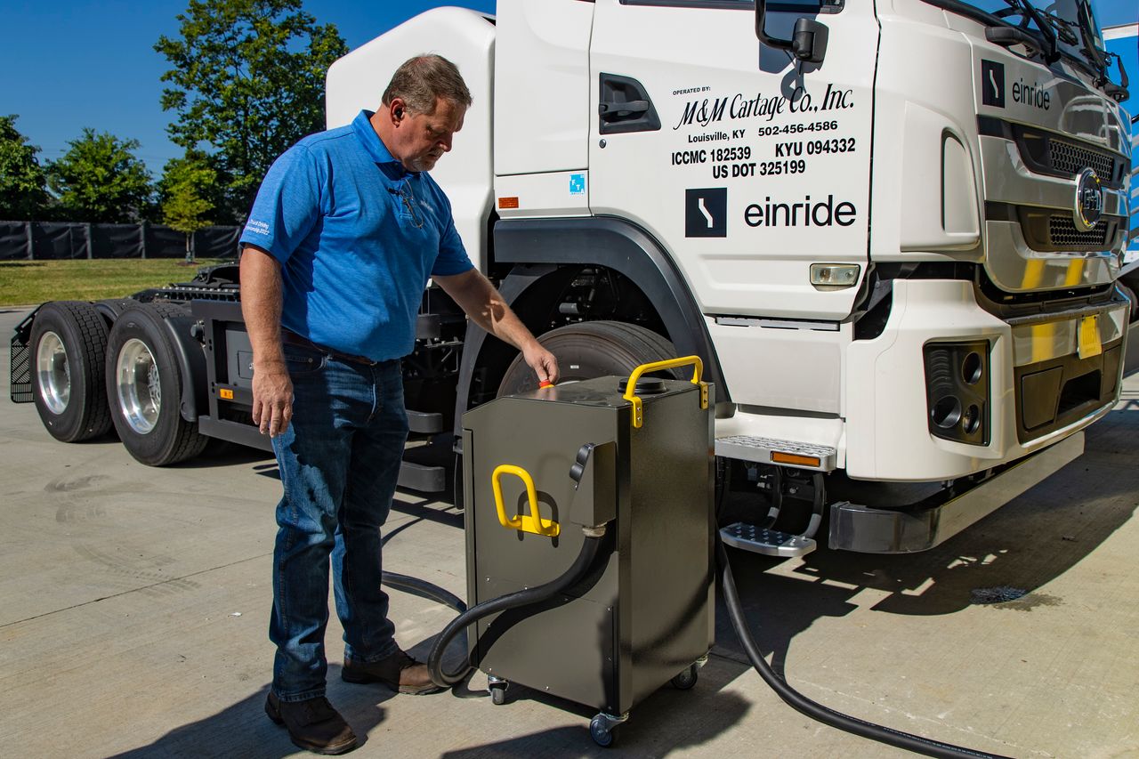 在肯塔基州路易斯維爾的GE Appliances物流中心,一名卡車司機正在為瑞典自動駕駛卡車初創公司Einride提供的電動卡車充電。圖片來源:GE Appliances計劃實現運輸業務電氣化的企業正尋求將倉庫轉變為充電樞紐,以應對日益壯大的電動卡車和貨運車隊充電需求。