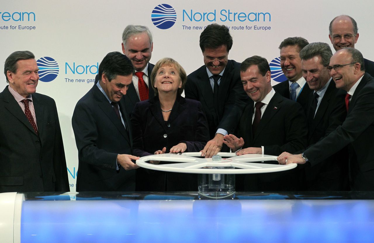 2011年,德國前總理格哈德·施羅德(左一)見證歐洲領導人轉動象徵啓動俄羅斯天然氣輸送的閥門,從左至右分別為法國總理弗朗索瓦·菲永、德國總理安格拉·默克爾、荷蘭首相馬克·呂特、俄羅斯總統德米特里·梅德韋傑夫和歐盟能源專員岡瑟·厄廷格。圖片來源:Sasha Mordovets/Getty Images