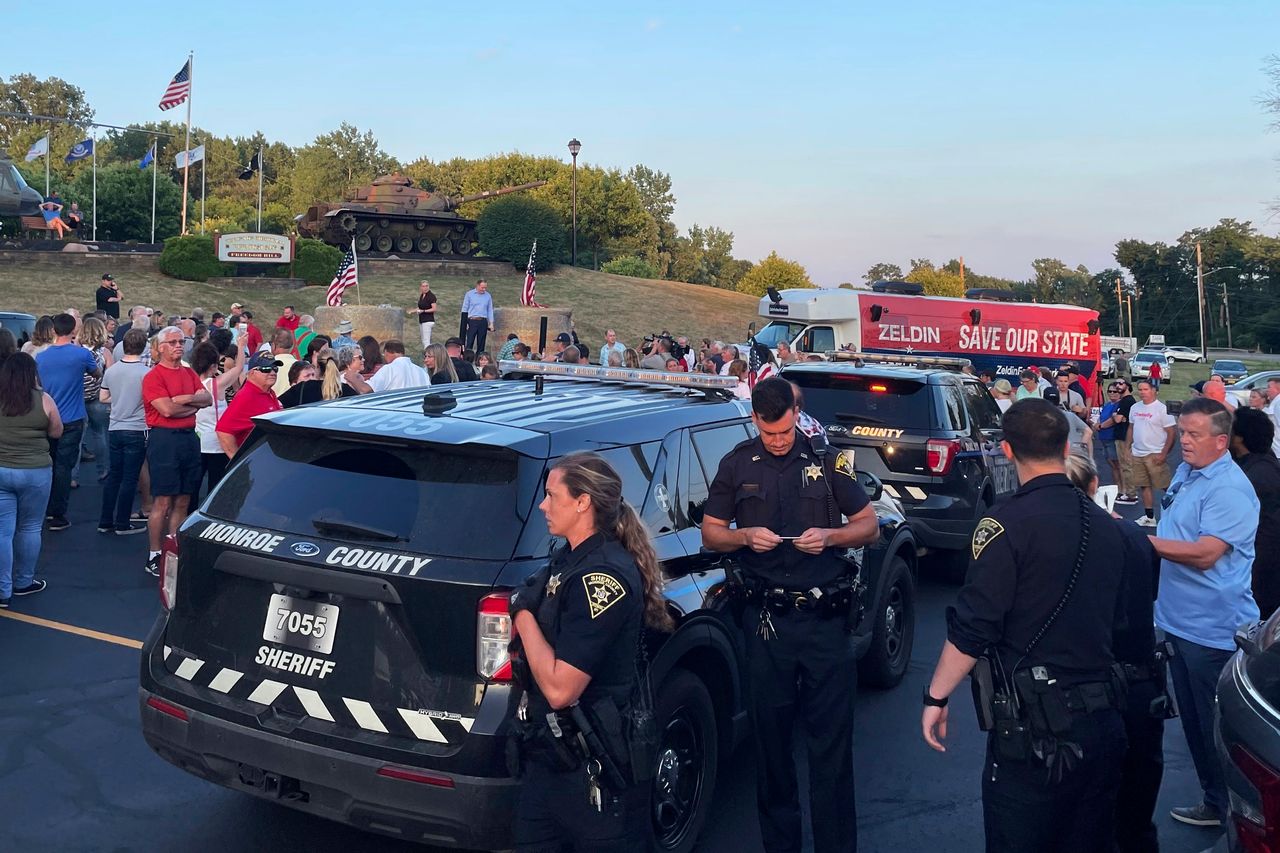 共和黨紐約州長候選人、眾議員李·澤爾丁週四遭遇明顯持刀襲擊後,警方在現場展開調查。照片:伊恩·温納/美聯社刊登於2022年7月23日印刷版,標題為《李·澤爾丁的襲擊者獲釋》。
