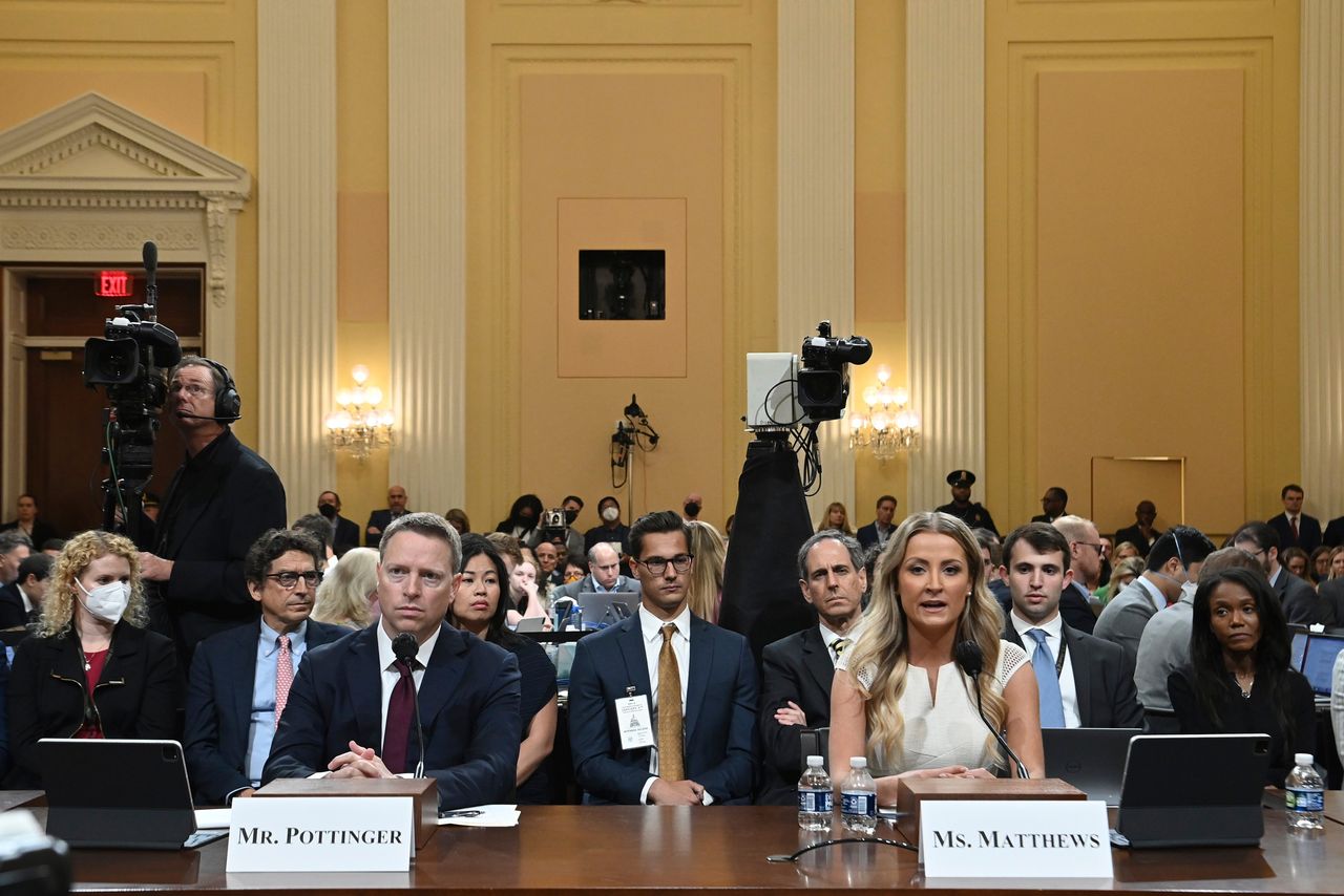 前副國家安全顧問馬修·波廷傑與前副新聞秘書莎拉·馬修斯本週出席了聽證會作證。圖片來源:索爾·勒布/新聞池公開聽證會僅展示了委員會為期一年調查的部分內容,該調查包括對1000多名證人的詢問和數萬份文件的審查。聽證會播放了數十位證人的視頻片段,其中包括白宮高級官員,但他們的完整證詞記錄尚未公佈。